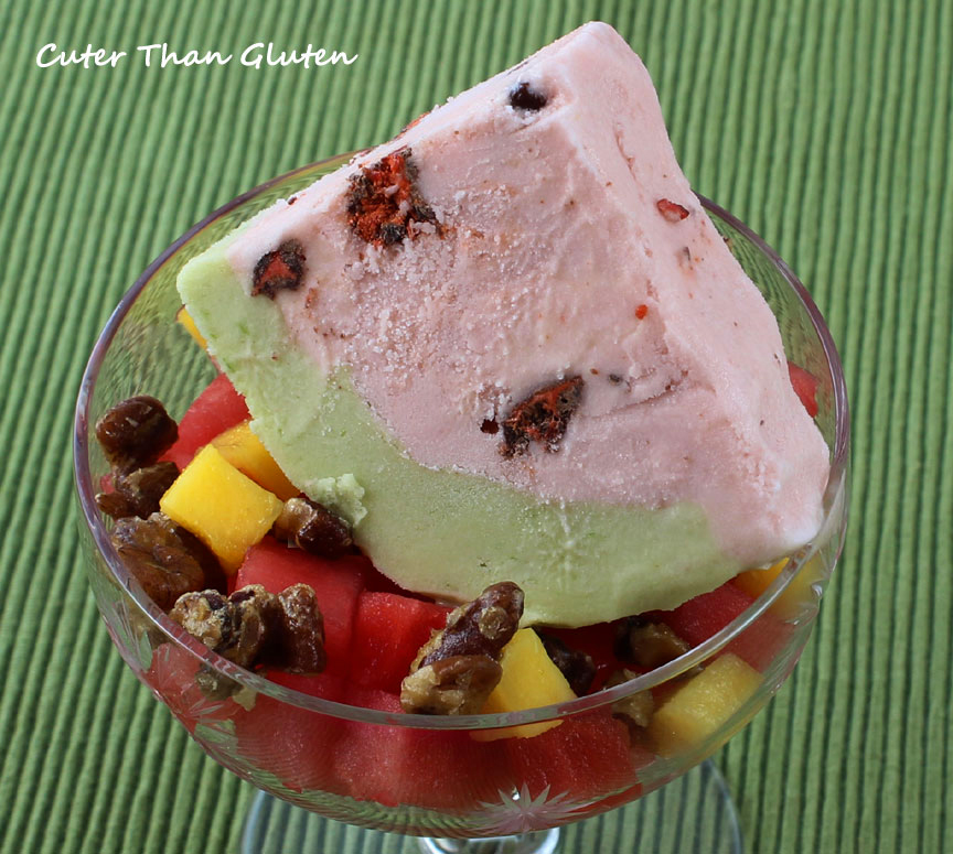 I formed my ice cream watermelon in a bowl, but it was a bit hard to get out. Next time I think I should try forming a log. I played around with the concept of what qualifies as a sundae. Fresh watermelon and peach with maple candy pecans serve as a base for the watermelon sherbet (below). Above, I layered lime sherbet, chocolate chips, watermelon sherbet, candied nuts, and topped with a chocolate dipped dehydrated watermelon slice.