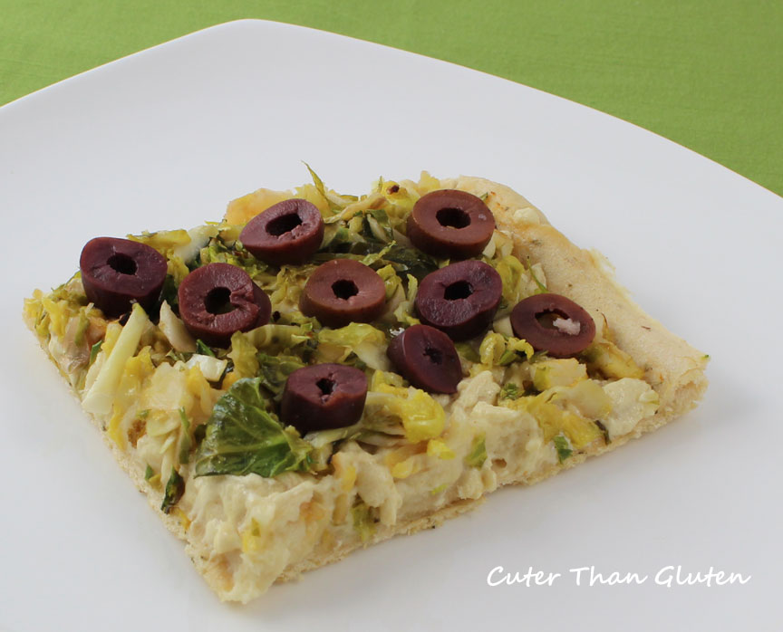When the pizza comes out of the oven, top with Brussels sprouts and olives and serve hot.