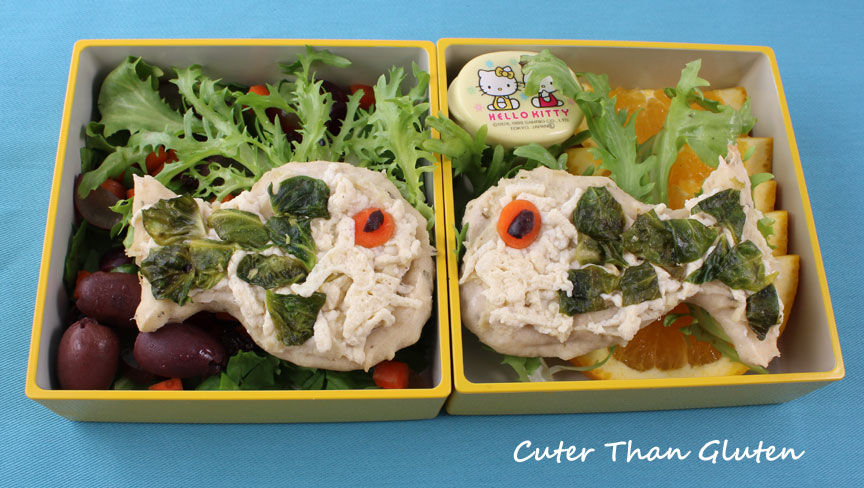 To make the fish I formed the pizza dough in the shape of tiny fish, then decorated the fish after the pizza was out of the oven with Brussels sprout leaves and carrot/olive eyes. There is a salad under one fish, with dressing in the container, and orange slices under the other fish.