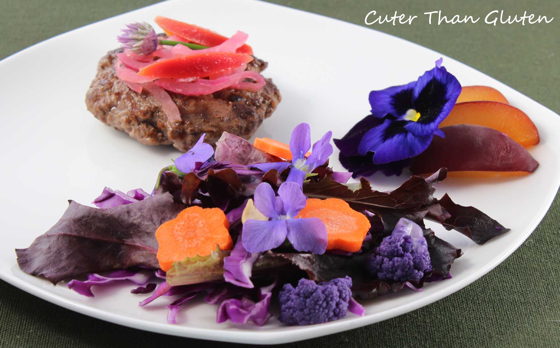 Red cabbage (I think it looks more purple then red), young lettuce leaves, violets from the yard, carrots cut with cookie cutter, chives, and a few purple cauliflowers. Not photographed is the peanut butter dressing that I made to drizzle on the salad. If only I had purple carrots… they do exist you know… but the orange made a fun splash of color!